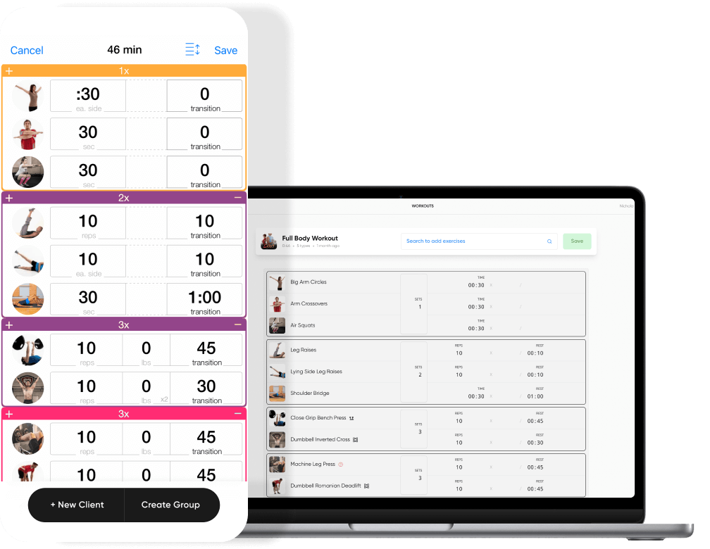 *We ran a speed test in Aug 2022 where one person with no prior workout building experience created the same workout on each platform. Calculations assumed 3 new workouts per client per workout phase, 6 week workout phases, and 20 clients per Trainer per year.